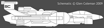 Amongst the chatter was a request for Ace Rimmer's Dimension Jump Ship, The Wildfire. (Great suggestion!) Luckily, I had bought an old magazine not to long ago which had enough photos of this spacecraft from Red Dwarf to enable me to draw up a schematic of it, (above). From this I can now plot out a three dimensional model in sketch-up and afterward convert that into a cool paper model...(But not before I've completed my other Red Dwarf projects first though - hay? :-)